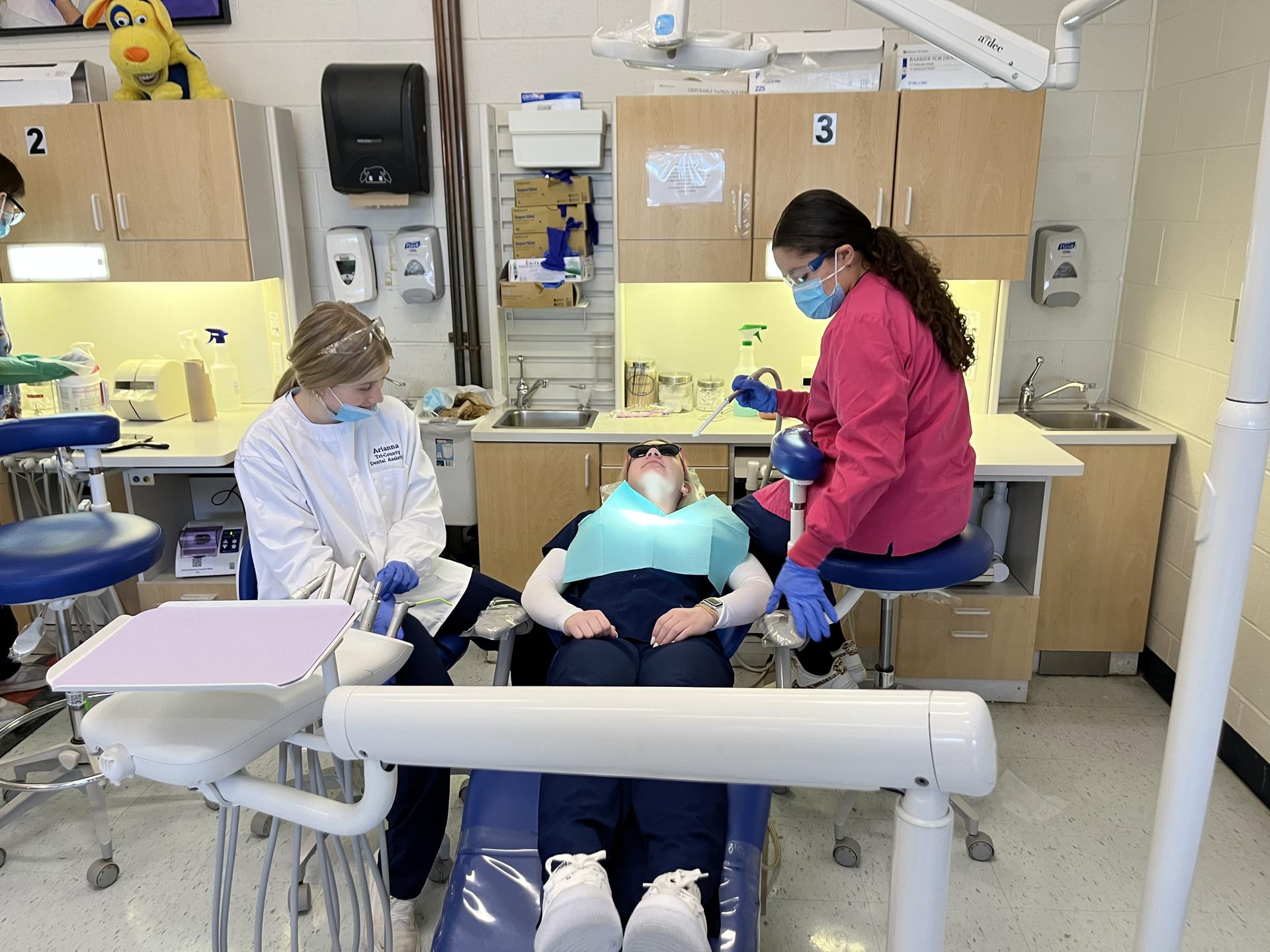Freshmen students are fully engaged in their vocational programs! The speed at which they begin to learn the vocabulary and skills of their trade is impressive. Pictured left are three Dental freshmen: Ari Weiner, Addie Smith and Gabby Leon-Perez. |
